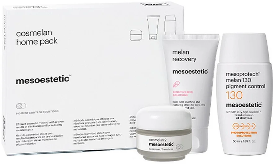 Набір для домашнього застосування методу cosmelan®. Містить продукти для дотримання рекомендацій щодо домашнього догляду професійного методу cosmelan® та доповнення депігментуючої дії щодо усунення та зменшення плям меланічного походження. На безперервній основі видаляє плями і регулює надмірну вироблення меланіну, щоб запобігти повторній появі плям у довгостроковій перспективі.