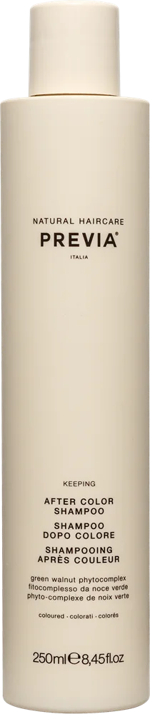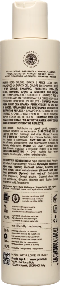 Natural Haircare Previa KEEPING After Color Shampoo Шампунь для окрашенных волос с фитокомплексом зеленого грецкого ореха. Деликатно очищает волосы, увлажняет их и придает блеск. Усиливает яркость цвета и удлиняет его стойкость. 97,5% ингредиентов натурального происхождения и ингредиентов, полученных органическим земледелием. СОДЕРЖИТ: - Фитокомплекс зеленого грецкого ореха: богатый фенолом с высоким молекулярным весом, который образует на волосах сетевую структуру, состоящую из протеинов и обеспечивает антиоксидантную защиту и защиту цвета даже после ополаскивания. - Экстракты лавсонии, семян льна и абрикоса: обладают антиоксидантными свойствами, защищают волосы от УФ-лучей, придают им блеск и обеспечивают увлажнение. ДЕЛИКАТНАЯ ФОРМУЛА Содержит совместимые с кожей и экологически чистые ингредиенты растительного происхождения. Без агрессивных химических веществ Без искусственных красителей Без ингредиентов животногопроисхождение Сертифицировано AIAB | Vegan Quality | Протестировано на содержание никеля Экологически безопасная упаковка PE GREEN — биопластик из возобновляемых источников (сахарный тростник). На 100% пригодна для вторичной переработки. НОТКИ АРОМАТА: аромат создан из цветочных, цитрусовых и деликатных ноток, завернутых в блеск, мягкость и элегантность. Верхние нотки розы и мандарина смешаны со средней ноткой кедрового дерева и завернуты в теплый аромат янтаря и ландыша. Верхние нотки • цитрусовые| средние нотки • деревянные| базовые нотки • амбровые
