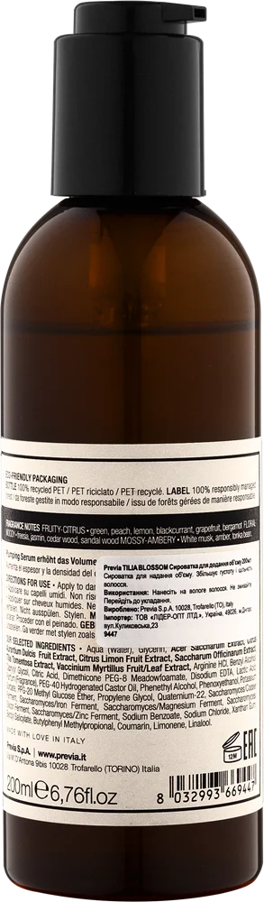 Сыворотка для придания объема. Увеличивает плотность и плотность волос. Содержит органический экстракт цветков липы – образует защитную гидролипидную пленку, сохраняет влагу в тканях и выступает в роли защитного барьера для волосяного стержня. Уменьшает пористость, придает волосам блеск и мягкость. Также содержит: экстракт сахарного клена, экстракт апельсина, экстракт лимона, экстракт сахарного тростника, экстракт ежевики, микроэлементы. Аромат Ароматные фруктовые нотки созданы для того, чтобы наполнить ваш день радостью и сделать каждый момент особенным. Удивительный микс: верхние нотки грейпфрута и персика гармонично контрастируют со средними кедровыми и сандаловыми нотками деревьев. ВЕРХНИЕ НОТКИ: фруктово-цитрусовые Зелень, персик, лимон, черная смородина, грейпфрут, бергамот НОТКИ СЕРДЦА: цветочно-древесные Фрезия, жасмин, кедр, сандал БАЗОВЫЕ НОТКИ: мохово-амбровые Белый мускус, амбра, бобы тонкая