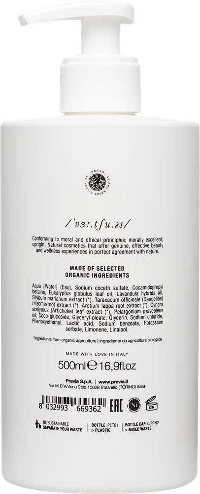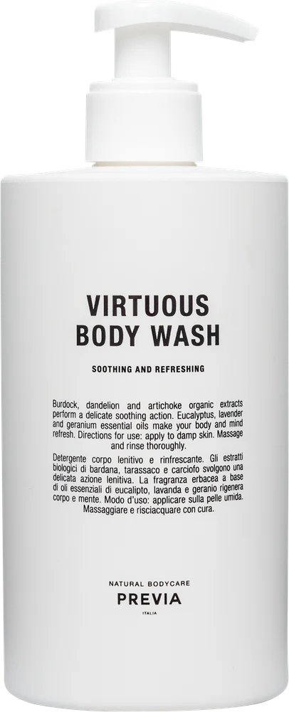 Previa Virtuous Body Wash Soothing and Refreshing Органические экстракты лопуха, одуванчика и артишока оказывают деликатное успокаивающее действие. Эссенциальные масла эвкалипта, лаванды и герани освежают и придают ощущение бодрости. Рекомендуется для повседневного применения.