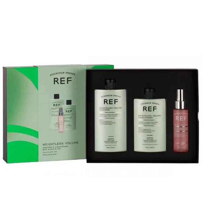 REF Gift Box Weightless Volume является идеальным подарком, который можно презентовать близким или побаловать себя, будь то праздник, день рождения или другой особый случай. В наборе представлены три продукта, созданные для волос, которым необходим дополнительный объем. Эти уникальные формулы специально разработаны для защиты, укрепления и улучшения структуры тонких или негустых волос. Продукты сочетают в своем составе питательные и ухаживающие компоненты, которые насыщают тонкие волосы полезными микроэлементами, дарят локонам максимальный объем, здоровый вид и роскошное сияние. Яркие цвета и изысканные детали этого набора отражают стиль бренда: красивый, естественный и увлекательный дух.
