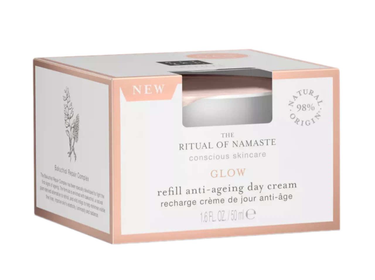 Продемонструйте турботу про свою шкіру та нашу планету еко-шикарними поповненнями денного антивікового крему від The Ritual of Namaste. Наповнювач ідеально вписується у вашу розкішну оригінальну баночку та містить ту саму легку формулу, яка оживляє шкіру та надає їй сяйва. Крем збагачений нашим новим унікальним відновлюючим комплексом Bakuchiol і допомагає мінімізувати появу тонких зморшок, покращує еластичність шкіри та захищає її від негативного впливу вільних радикалів. Ефект? М’якша та пружніша шкіра з молодшим виглядом.