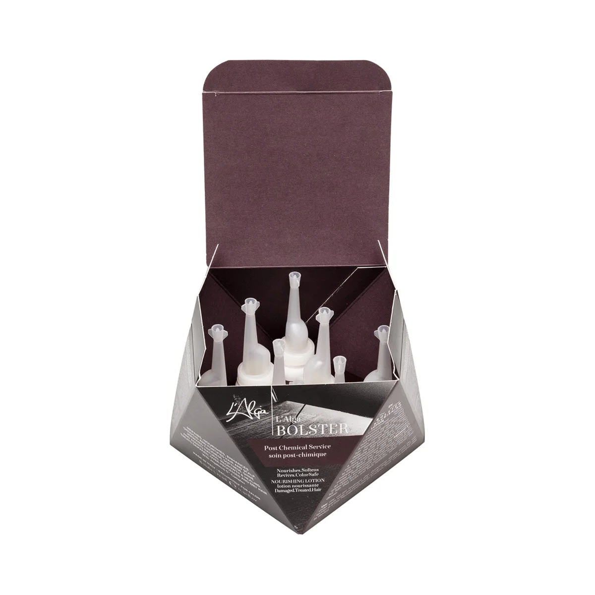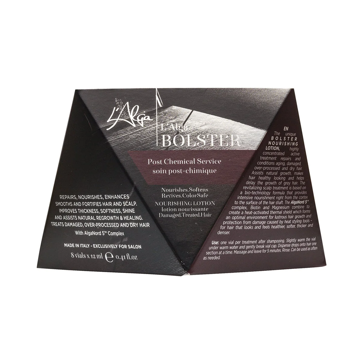 Унікальний BOLSTER NOURISHING LOTION, висококонцентрований активний засіб, відновлює і усуває проблеми старіння пошкодженого, надмірно обробленого і сухого волосся. Сприяє природному росту, робить волосся здоровим і уповільнює появу сивини. Відновлювальна процедура для шкіри голови заснована на формулі біотехнології, яка забезпечує інтенсивне живлення кожного волосяного стрижня зсередини. Комплекс AlgaNord 5 ™, біотин і магній у поєднанні створюють екран, що активується теплом і формує оптимальне середовище для росту блискучого волосся та захисту від теплового пошкодження. Волосся стає більш здоровим, м'яким і густим, набуває щільності.