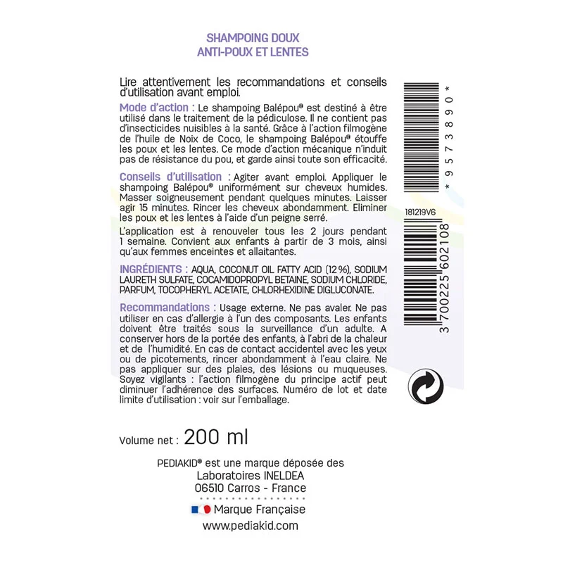 PEDIAKID НАТУРАЛЬНИЙ ШАМПУНЬ ПРОТИ ВОШЕЙ ТА ГНИД ДЛЯ ДІТЕЙ ВІД 3 МІСЯЦІВ / BALEPOU SHAMPOING 200 мл