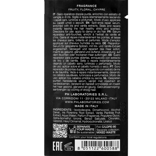 Серум для посічених кінчиків з екстрактами ірису та ванілі. Миттєво запаює та відновлює кінчики, залишаючи волосся здоровим та блискучим. Наповнює легким, приємним ароматом.
