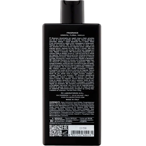 Шампунь для приборкання неслухняного волосся, що пушиться, збагачений олією моной та екстрактом магнолії. Делікатно очищає, робить волосся гладким і шовковистим, залишаючи на ньому легкий, приємний аромат. Ущільнює текстуру волосся, полегшує розчісування й істотно скорочує час укладання.
