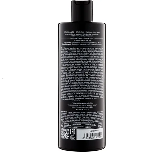Спеціальний шампунь з соєвими протеїнами та олією макадамії для підтримання результатів після процедури випрямлення. Формула без сульфатів делікатно очищає волосся, зберігаючи ефект шовковистої гладкості на тривалий час. Відновлює нормальний фізіологічний рівень pH волосся та робить його надзвичайно м'яким.