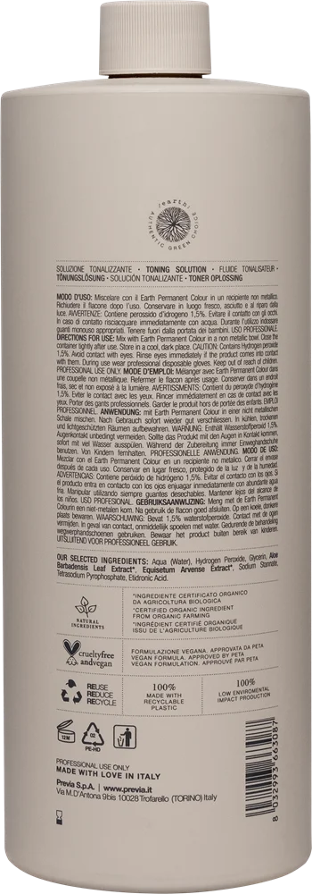 Проявник для фарби. У поєднанні з фарбами для волосся від Previa Earth допомагає створити відтінки, які ідеально підходять для покриття першого сивого волосся. Також для відновлення чутливого або вже обробленого волосся.