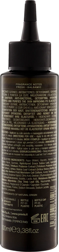 Надає антисептичну та антибактеріальну дію. Детокс. Дбайливо очищає шкіру голови, зволожує, підвищує її тонус та еластичність. Стимулює оновлення клітин і сприяє насиченню шкіри голови киснем. Відновлює природний баланс мікрофлори шкіри голови.