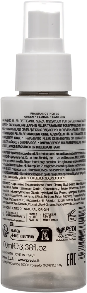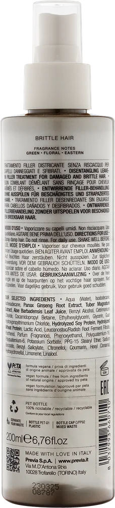 Розплутувальний незмивний філер-догляд для пошкодженого і ламкого волосся. Миттєво кондиціонує та зволожує волосся без обтяження. Покращує розчісування, зменшує наелектризованість, регенерує і надає антиейдж-дію.