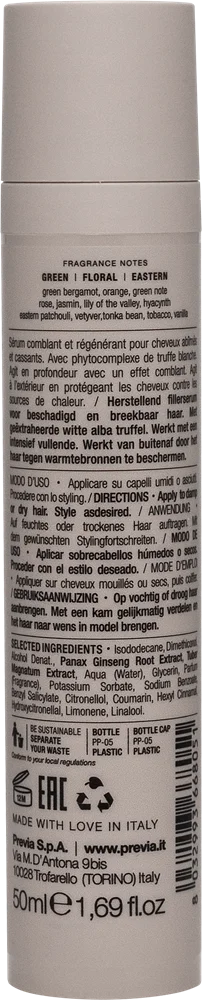 Заповнювальний ефект антиейдж філер-догляду гарантований фітокомплексом біозрідженого білого трюфеля, рідкісного і цінного гриба, що має яскраво виражені противікові, енерджайзинг і відновлювальні властивості. Фітокомплекс багатий вітаміном В, стимулює регенерацію протеїнів у структурі волосся, збільшуючи його еластичність. Проникає глибоко з заповнювальним ефектом, регенеруючи волосся та роблячи його м'яким і блискучим.