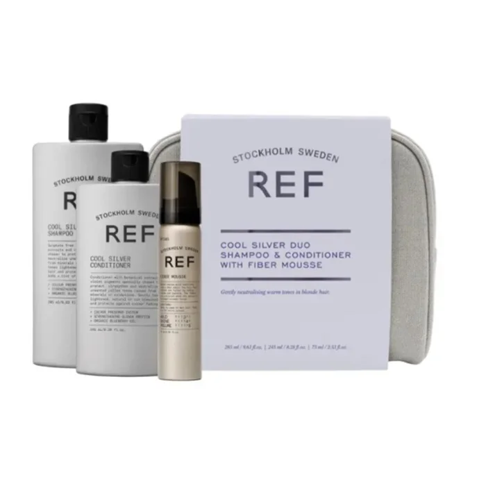 Набір доглядових засобів, створений спеціально для світлого фарбованого або сивого волосся. У наборі є безсульфатний шампунь та кондиціонер з фіолетовими пігментами, які усувають небажані жовті відтінки, викликані окисленням або мінеральними речовинами. Обидва засоби дбайливо тонують натуральне світле, освітлене або вибілене сонцем волосся і захищають від вицвітання та вимивання кольору. Доповнює дует мус для стайлінгу, який дарує укладанню гарний об'єм, а також зручна косметичка, що дозволяє брати необхідні засоби з собою у подорож або зберігати їх в одному місці.
