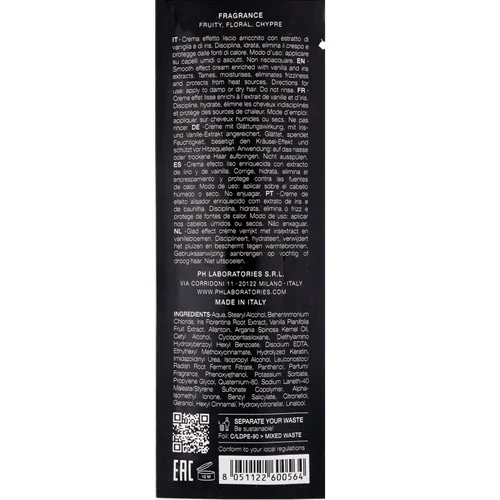 Крем с разглаживающим эффектом. Обогащен экстрактами ванили и ириса. Укрощает и увлажняет волосы, устраняет пушистость и защищает от высоких температур. Активные ингредиенты: - экстракт ириса • из корневища ириса экстрагируют ценные активные ингредиенты, среди которых меристиновая кислота, известная своими косметическими успокаивающими, тонизирующими и защитными свойствами. Дарит волосам блеск и сияние, делает его невероятно мягкими на ощупь. - экстракт ванили • ваниль – растение, принадлежащее к семейству орхидных, родом из Мексики и тропических регионов. Придает волосам блеск, шелковистость и мягкость. Уменьшает пушистость и помогает предотвратить образование секущихся кончиков. Аромат: Верхние нотки • фруктовые • игривый аромат, открывающийся нотками груши, личи и сочными нотками земляники. Средние нотки • цветочные в сердце композиции женственные нотки розы, дополненные нотками кедрового дерева. Базовыенотки • шипровые • базу композиции составляют нотки пачули и кремовой ванили. Применение: нанесите на влажные или сухие волосы. Не смывайте.