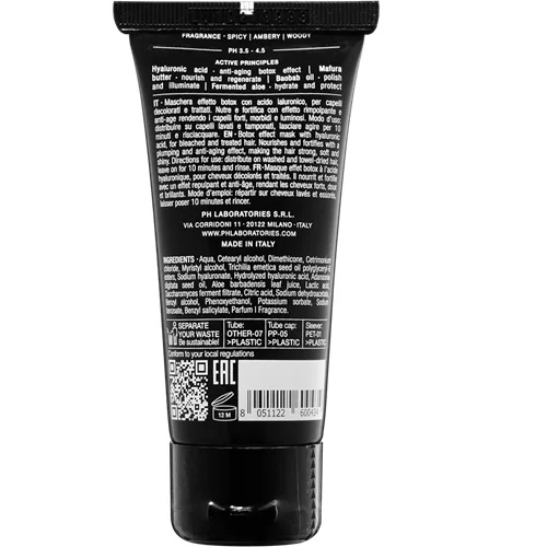 Маска с эффектом ботокса, обогащенная гиалуроновой кислотой, для обесцвеченных и поврежденных волос. Питает и укрепляет волосы, оказывая уплотнительное и антиэйдж-действие. Делает волосы сильными, мягкими и блестящими. рН 3.5 – 4.5 АКТИВНЫЕ ИНГРЕДИЕНТЫ: • Гиалуроновая кислота: глубоко увлажняя структуру волос, оказывает антиэйдж ботокс-эффект. Укрепляет и реструктурирует волосяной стержень, образует защитную пленку, препятствующую испарению влаги. В результате волосы становятся более устойчивыми к ломкости, приобретают блеск и упругость. • Масло мафуры: богато незаменимыми жирными кислотами (такие как олеиновая, пальмитиновая и линолевая), является прекрасным кондиционером для сухих волос, питает их и способствует регенерации, восстанавливая поврежденные кончики. Глубоко питает кожу головы и помогает поддерживать нормальный рост волос. • Масло баобаба: благодаря высокому содержанию незаменимых жирных кислот, витаминов С и Е имеет мощные увлажняющие, питательные ирегенерирующие свойства. Эффективно препятствует сухости, ломкости и потере блеска. Богата антиоксидантами, которые нейтрализуют активность свободных радикалов. Полирует поверхность волосяного стержня и усиливает яркость цвета. • Ферментированное алоэ: новое активное косметическое вещество, полученное в результате инновационного процесса гиперферментации. Эта запатентованная технология превращает простые сахара в метаболиты косметической важности, способные поддерживать увлажнение волос, даже если они подвергаются длительному термическому стрессу. АРОМАТ: Верхние ноты – пряные: бергамот, апельсин, пряный аккорд, амбра Ноты сердца – амбровые: лабданум, бензоин, стиракс, кедр Базовые ноты – древесные: ваниль, пачули, ветивер, белый мускус. Применение: распределите равномерно легкими массирующими движениями по вымытым, подсушенным полотенцем волосам. Для лучшего распределения разделите волосы на пряди. Оставьте на 10 минут, затем тщательно смойтетеплой водой.