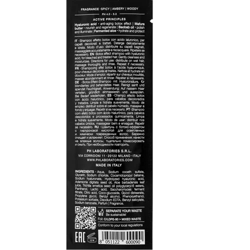 Шампунь с эффектом ботокса, обогащенный гиалуроновой кислотой, для обесцвеченных и поврежденных волос. Деликатно очищает и увлажняет волосы. рН 4.0 – 5.0 АКТИВНЫЕ ИНГРЕДИЕНТЫ: • Гиалуроновая кислота: глубоко увлажняя структуру волос, оказывает антиэйдж ботокс-эффект. Укрепляет и реструктурирует волосяной стержень, образует защитную пленку, препятствующую испарению влаги. В результате волосы становятся более устойчивыми к ломкости, приобретают блеск и упругость. • Масло мафуры: богато незаменимыми жирными кислотами (такие как олеиновая, пальмитиновая и линолевая), является прекрасным кондиционером для сухих волос, питает их и способствует регенерации, восстанавливая поврежденные кончики. Глубоко питает кожу головы и помогает поддерживать нормальный рост волос. • Масло баобаба: благодаря высокому содержанию незаменимых жирных кислот, витаминов С и Е обладает мощными увлажняющими, питательными и регенерирующими свойствами. Эффективно препятствует сухости,ломкости и потере блеска. Богата антиоксидантами, которые нейтрализуют активность свободных радикалов. Полирует поверхность волосяного стержня и усиливает яркость цвета. • Ферментированное алоэ: новое активное косметическое вещество, полученное в результате инновационного процесса гиперферментации. Эта запатентованная технология превращает простые сахара в метаболиты косметической важности, способные поддерживать увлажнение волос, даже если они подвергаются длительному термическому стрессу. АРОМАТ: Верхние ноты – пряные: бергамот, апельсин, пряный аккорд, амбра Ноты сердца – амбровые: лабданум, бензоин, стиракс, кедр Базовые ноты – древесные: ваниль, пачули, ветивер, белый мускус. Применение: распределите шампунь равномерно по влажным волосам и хорошо помассируйте, чтобы как следует его очистить. Тщательный массаж кожи головы стимулирует микроциркуляцию, способствуя росту волос.