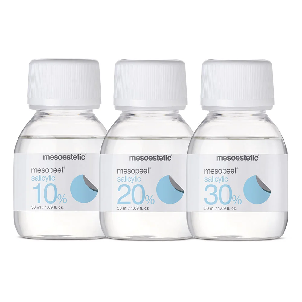Пилинг на основе салициловой кислоты для жирной и склонной к угревой сыпи кожи Салициловая кислота Название салициловой кислоты происходит от латинского Salix – название ивы, из чьей коры ее добывали сначала. Салициловая кислота – бета-гидрокси кислота (BHA) с мощным кератолитическим, комедонолитическим, противовоспалительным и антибактериальным действием. Салициловая кислота позволяет разрушать межклеточные связи, уменьшать адгезию корнеоцитов и усиливать реструктуризацию кожи, не вызывая образования воспалительных инфильтратов. Учитывая свою липофильность, салициловая кислота легко проникает в волосяной фолликул, контролируя секрецию сальных желез. Салициловая кислота также регулирует выделение кожного сала, оказывает антисептическое, бактериостатическое и противогрибковое действие. Салициловый пилинг Salicylic peel AS действует непосредственно на проблемы жирной и склонной к угревой сыпи кожи: белые угри и дефекты. Эксклюзивная формулапилинг позволяет ему смешиваться с кожным салом на поверхности эпидермиса и в фолликулах. Поэтому Salicylic peel AS рекомендуется использовать при загрязнениях и акне, пилинг эксфолирирует и очищает как поверхность кожи, так и поры. Mesopeel salicylic пилинги подходят для всех типов кожи, в том числе сухой, склонной к гиперкератинизации и жирной, склонной к акне, комедогенной и/или себорейной коже. Кроме того, рекомендуются для тела в области верхних конечностей, спины, колен, локтей и т.д. Показания: Рекомендуется для жирной и склонной к угревой сыпи кожи. Концентрация: 10%, 20%, 30%. Салицилловый пилинг mesopeel salicylic 10% 50 ml, pH 1.8, Прозрачный гель на спиртовой основе Показания: подготовительный пилинг контроль секреции сальных желез уменьшение размера пор выравнивание тона кожи Рекомендации: Гулбоко очищает кожу перед другими медицинскими процедурами. Идеально использовать перед биоревитализацией препаратамиmesohyal. Салициловый пилинг mesopeel salicylic 20% 50 ml, pH 1.8, Прозрачный гель на спиртовой основе Показания: расширенные поры неглубокие шрамы по акне умеренный старческий кератоз себорейный дерматит Салициловый пилинг mesopeel salicylic 30% 50 ml, pH 1.8, Прозрачный гель на спиртовой основе Показания: расширенные поры средние шрамы от акне камедоны и умеренно зажженные акне себорейный дерматит старческий кератоз