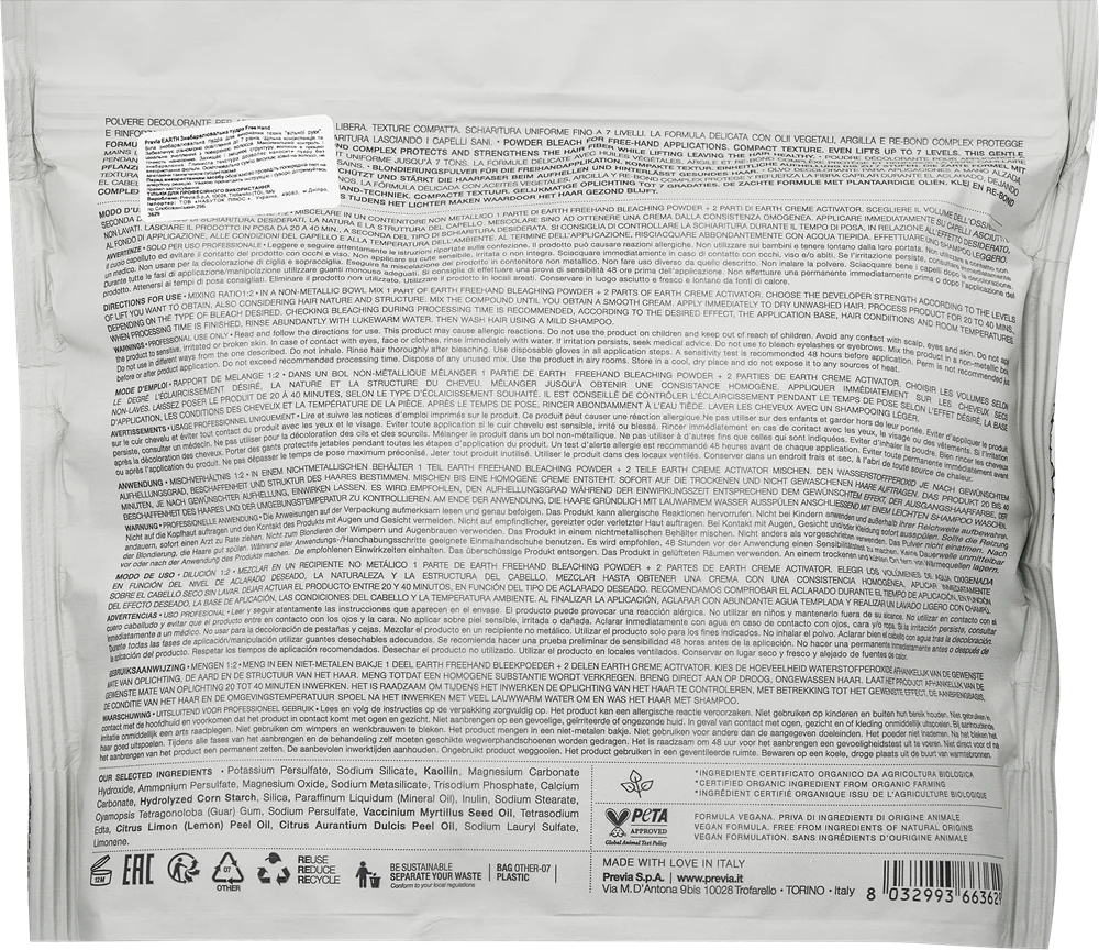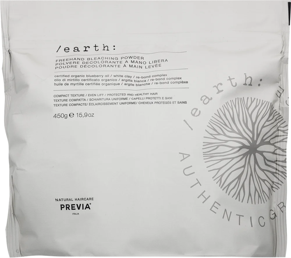 Natural Haircare Previa Earth FreeHand Bleaching Powder Белая обесцвечивающая пудра для выполнения техник "свободной руки". Обеспечивает равномерное освещение до 7 уровней. Плотная консистенция и идеальное сцепление с поверхностью волос. Максимальный контроль и точность нанесения. Защищает и укрепляет структуру волос в процессе обесцвечивания. Глинистая текстура позволяет наносить пудру без использования фольги. Осветительная смесь высыхает снаружи на волосах, не затрагивая таким образом соседние пряди. Продукт продолжает действовать изнутри. АКТИВНЫЕ ИНГРЕДИЕНТЫ: Содержит ингредиенты натурального происхождения и ингредиенты, полученные органическим земледелием. - сертифицированное органическое масло черники; - эссенциальные масла лимона и апельсина; - белая глина; - Комплекс RE-BOND: оказывает увлажняющее и смягчающее действие, укрепляет и защищает волосы, сохраняя их здоровыми и плотными. VEGAN FRIENDLY ФОРМУЛА БЕЗ ЗАПАШНИКОВ