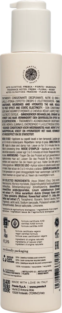 Natural Haircare Previa ALMOND&LINSEED OIL Smoothing Taming Conditioner Previa ALMOND&LINSEED OIL Кондиционер для укрощения волос С органическим экстрактом миндаля и маслом семян льна. Уход за кондиционированием. Действует на поверхности волос. Уменьшает спутывание и завывание. Снимает статическое напряжение. СОДЕРЖИТ: - Экстракт миндаля - масло высвобождает всю энергию содержащихся в миндале энзимов и делает его инновационным фитокомплексом, в состав которого входят жирные монокислоты и диглицериды. Усиливает упругость и увлажнение. - Масляный экстракт льняных семян – масло активирует энзимы, превращая экстракт в инновационный фитокомплекс, содержащий моножирные кислоты и диглицериды. Усиливает эффект увлажнения и эластичности. НОТКИ АРОМАТА: мягкий бриз аромата белых лепестков постепенно опускается на вас, раскрывая красоту мечты. Прекрасный аромат цветков апельсина открывает дверь в рай, на мускусный путь.