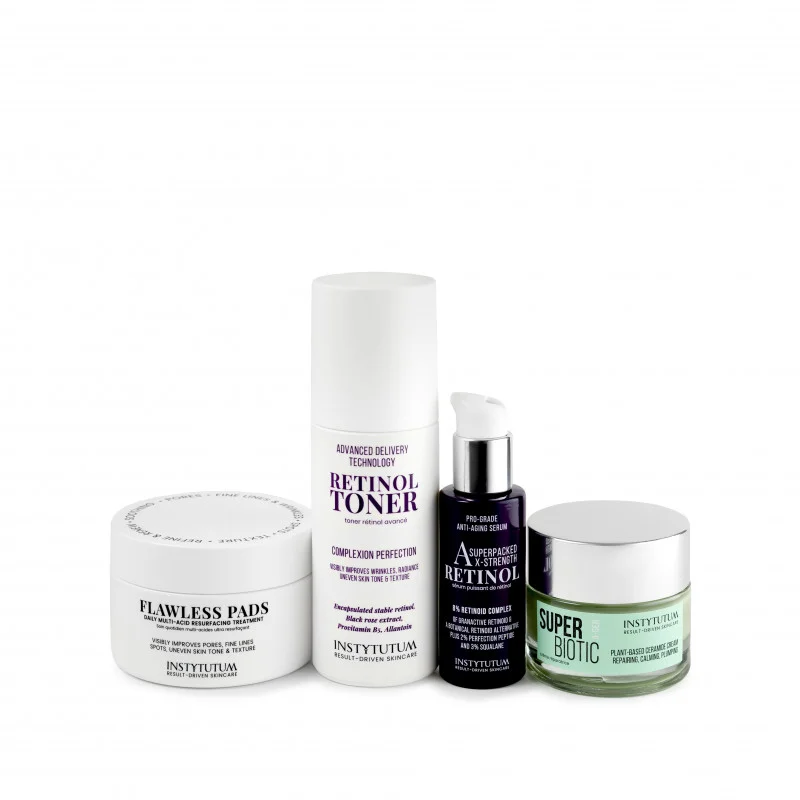 ПРОДУКТЫ РАЗРАБОТАННЫ, ЧТОБЫ Усиливать эффект друг друга Линейка бренда создана таким образом, чтобы все продукты комбинировались между собой, не раздражая кожу. Поэтому вы можете быть уверены в безопасности использования дома и в результате. 1. ТОНЕР С РЕТИНОЛОМ ADVANCED RETINOL TONER – обновляет кожу изнутри благодаря инкапсулированному стабильному ретинолу Inumax (его особенность – низкий риск раздражения при высокой эффективности) в концентрации 0,08%. В составе также аллантоин, пантенол и экстракт черной розы, усиливающие защитную функцию кожи, ускоряющие ее обновление, сужающие поры и освещающие пигментные пятна. Через 2 недели использование демонстрирует значительное уменьшение высыпаний. 2. СЫВОРОТКА С РЕТИНОИДОМ ANTI-AGING X-STRENGTH RETINOL SERUM — Мощный высоконцентрированный 8% ретиноидный комплекс: в состав входит ретиноид нового поколения (HPR), который благодаря молекулам маленького размера проникает в самые глубокие слои кожи и эффективно убирает воспаление.освещает пигментные пятна и выравнивает текстуру кожи. Дополнительную эффективность средства придают сине-зеленые водоросли, пептид Р3, сквалан, витамин Е, В5 и другие. Благодаря такому комплексу ингредиентов сыворотка работает быстро – по результатам клинического исследования резкое уменьшение морщин наблюдалось уже через 2 недели. При регулярном применении обновление кожи только усиливается и становится стойким. 3. ВОССТАНОВИТЕЛЬНЫЙ КРЕМ SUPERBIOTIC PLANT-BASED CERAMIDE CREAM – крем на основе керамидов растительного происхождения укрепляет защитный барьер, восстанавливает баланс микробиому, защищая кожу от ежедневных раздражителей. В составе: омега-жирные кислоты, сквалан и полиглутаминовая кислота делают кожу эластичной и хорошо увлажненной; пробиотический комплекс, экстракт гриба альбатреллуса, провитамин B5, мощные адаптогены черимоя и роза дамасская — борются с негативным влиянием свободных радикалов и помогают коже лучше справляться споследствиями стресса. Уже через 15 мин после нанесения заметно уменьшается краснота. 4. ПИЛИНГ-ПАДЫ FLAWLESS PADS – мультикислотные подушечки, отшелушивающие отмершие клетки кожи, а также регулирующие выработку себума. Кислоты в составе (общая концентрация 10% – микс гликолевой, молочной, салициловой и лимонной) обеспечивают выраженный эффект эксфолиации, а вместе с ней – освещение и сужение пор, выравнивание тона и текстуры кожи. В то же время гиалуроновая кислота и пантенол увлажняют и смягчают. Экстракт портулака – противовоспалительный ингредиент и антиоксидант. Пады также стимулируют синтез коллагена и обновление клеток, корректируют гиперпигментацию кожи. Заметен эффект использования уже через 4 недели. Почему вы полюбите его РЕЗУЛЬТАТ: КОЖА БЕЗ ВЫСЫПАНИЙ Акне и воспаления могут проявляться и во взрослом возрасте, мешая чувствовать себя уверенно. Докучающие и нервничающие симптомы: местныепокраснение, отеки и нарушения чувствительности, папулезная сыпь, зуд, сухость, расширенные поры, жирная кожа лица, красно-фиолетовые пятна на коже после акне. Цели ухода за кожей с воспалением и акне Снять воспаление, предотвратить выработку избыточного себума, уменьшить поры и покраснения, осветить, улучшить гидратацию. Протокол от кандидата медицинских наук Натальи Деркач "Антизопаление" является научно обоснованной процедурой ухода, чтобы помочь ваш