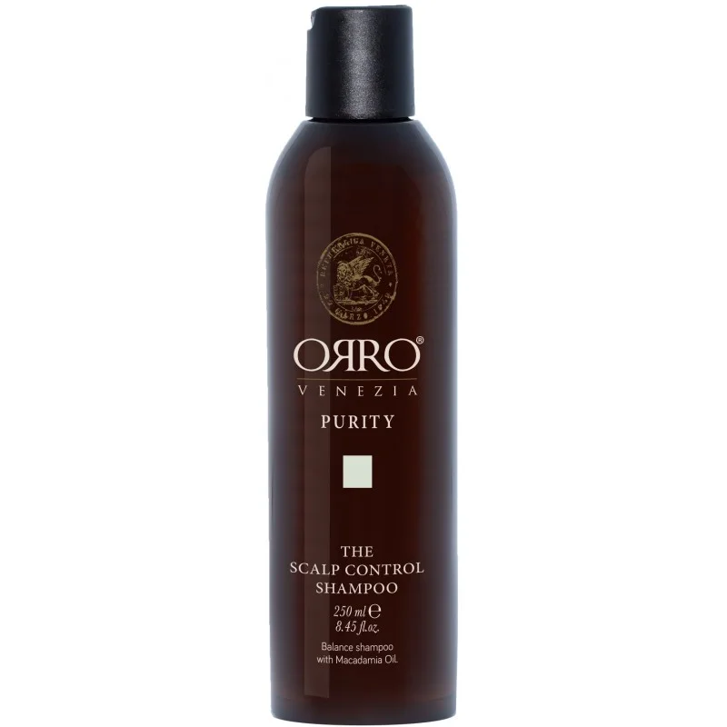 ORRO PURITY Scalp Control Shampoo - Шампунь для очищения кожи головы. Благодаря своему успокаивающему и балансирующему эффекту, мягко очищает и успокаивает раздраженную кожу головы. Также подходит для самых чувствительных волос. Противодействует перхоти и регулирует избыточную выработку кожного сала. Придает блеск и обесблеск тонким волосам. Экстракты березы и отдельные растительные компоненты оказывают антисептическое и кожно-регулирующее действие. Эфирное масло розмарина сохраняет и защищает липидный баланс кожи головы. Шампунь эффективно успокаивает и мягко очищает голову. Комплекс органического масла макадамии, экстрактов березы, экстрактов арники и эфирного масла розмарина способствует противомикробному и противовоспалительному воздействию на коже головы. Шампунь регулирует чрезмерную выработку кожного сала и противодействует перхоти.