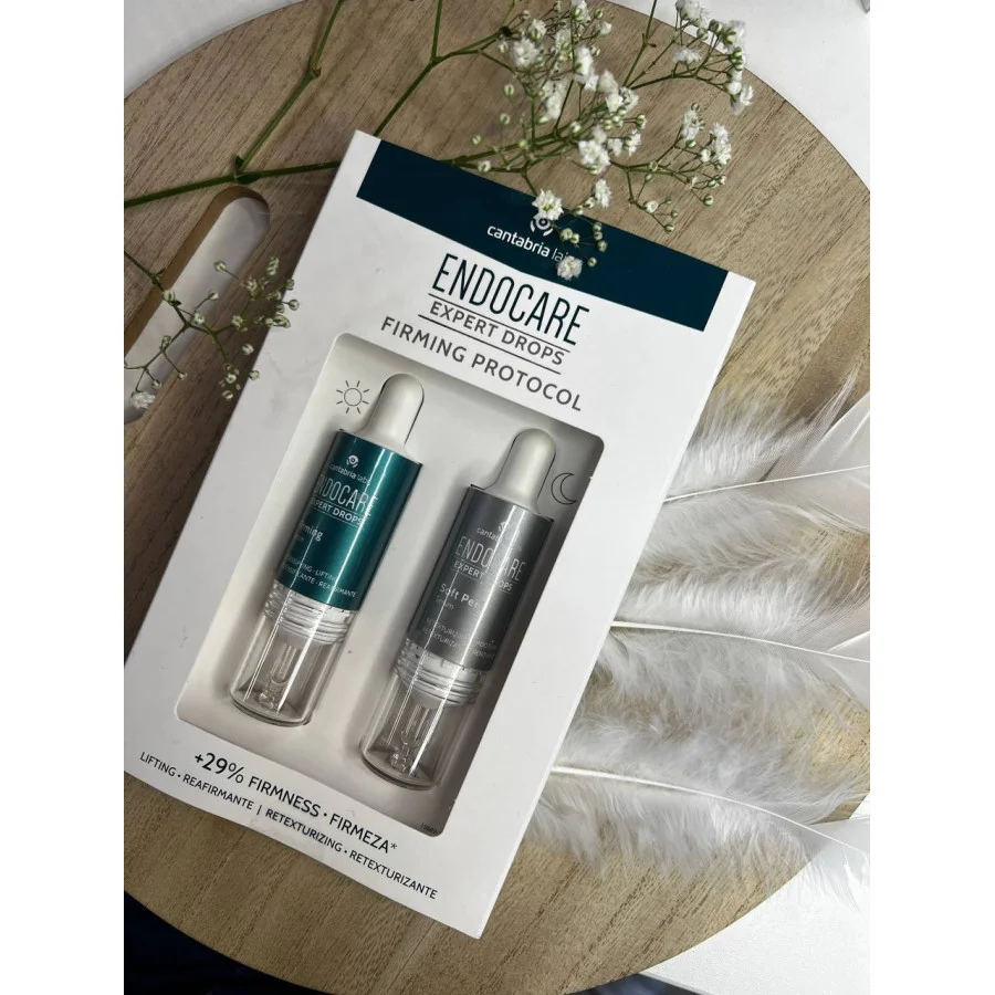 ENDOCARE EXPERT DROPS Firming Serum (Cantabria Labs) – Укрепляющая лифтинг-сыворотка Комбинация активных ингредиентов (комплексы SCA® и Collagen Boost) обеспечивает лифтинг, глубокую регенерацию и укрепление кожи. Повышает гладкость и упругость. Для интенсивного омоложения кожи. Активные ингредиенты: фильтрат секрета улитки (SCA®), экстракт листьев луговики антарктического (EDAFENCE®), гиалуронат натрия, экстракт грибов Шиитаке, фитиновая кислота, гидролизат протеинов сои, глицерин, аргинин. ENDOCARE EXPERT DROPS Soft Peel Serum (Cantabria Labs) - Мягкая обновляющая сыворотка-эксфолиант Обладает свойствами химического и энзимного пилинга, улучшая клеточное обновление. Для выравнивания текстуры, разглаживания морщин, улучшения тона кожи. Активные ингредиенты: ниацинамид, пантенол, бакучиол, ретинол, экстракт граната, лизоцим, трегалоза, протеаз. Предупреждение: встряхнуть перед применением. Нормой является легкое покалывание во время первых применений. Цвет продуктаможет варьироваться из-за высокой концентрации активных ингредиентов, что не влияет на эффективность препарата. Хранить при температуре выше 30°С. Рекомендуется использовать солнцезащитное средство Heliocare в течение дня. Способ применения: наносить ежедневно на чистую и сухую кожу 3-5 капель в зависимости от сочетания зон применения (лицо/шея/зона декольте). Укрепляющая лифтинг-сыворотка Firming Serum утром и пилинг-сыворотка Soft Peel Serum вечером. Объем: 2 флакона по 10 мл.