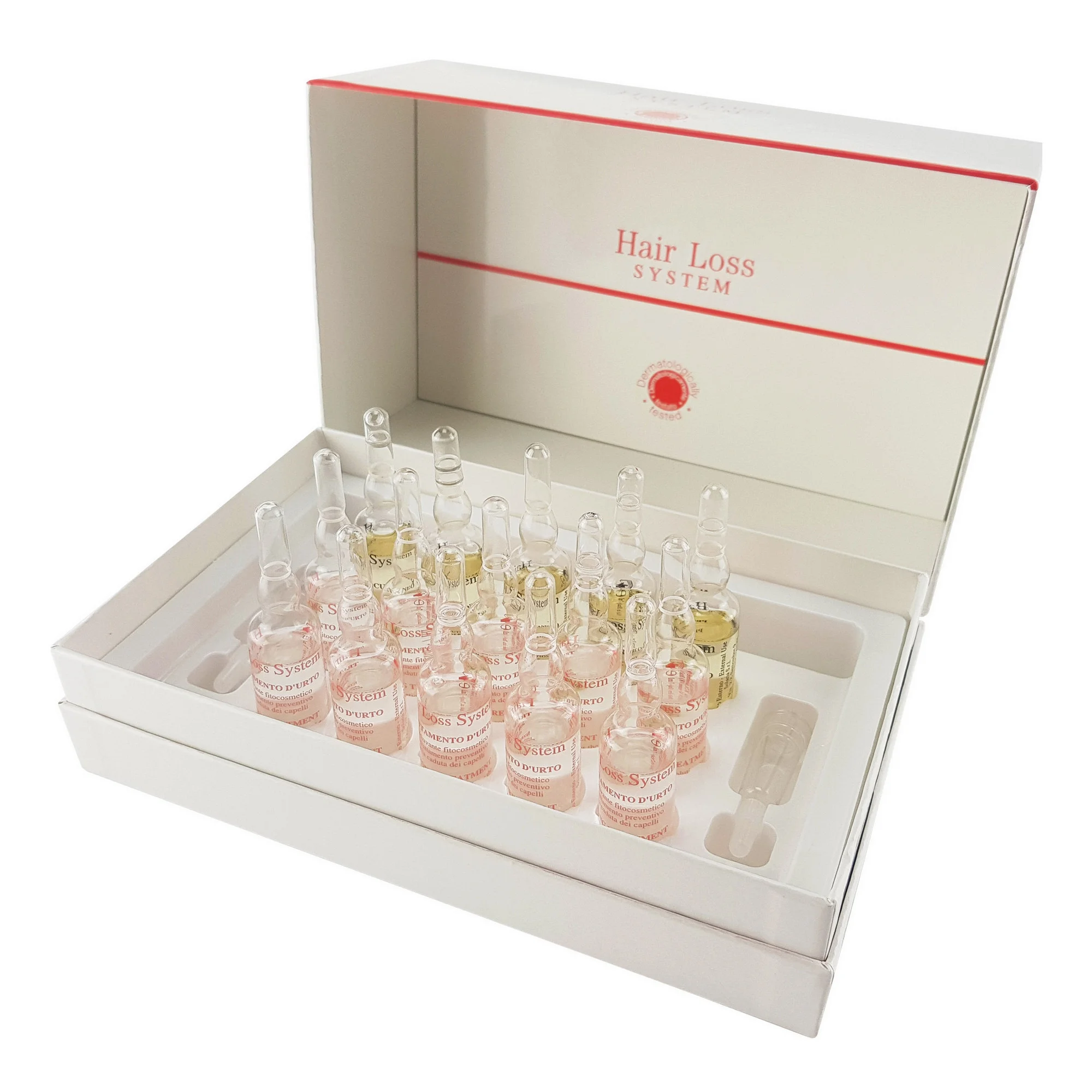 HAIR LOSS SYSTEM — система фітокосметичних процедур, що мають дві фази, допомагає у запобіганні випадінню волосся та зміцнює слабке волосся. Набір включає два види ампул: підготовча ампула (жовтого кольору) та ампула терапії (білого кольору). Підготовник за допомогою активних очищаючих, зволожуючих речовин, що мають також себорегулюючу та кератонолітичну функції, сприяє кращому проникненню кисню в шкірну поверхню голови, усуває її потовщення, що відбулося через відмерлі клітини, балансує гідроліпідний шар. Ампула терапії базується на синергічній дії активних компонентів, таких як: Capsicum (гострий перець), який має стимулюючий циркуляцію крові ефект, і фітоекстракти, серед яких женьшень виконує поживну та зміцнювальну функції. Але головне завдання лежить на глікопротеїнах та гідроглікосамміногліканах, що входять до складу білої ампули.